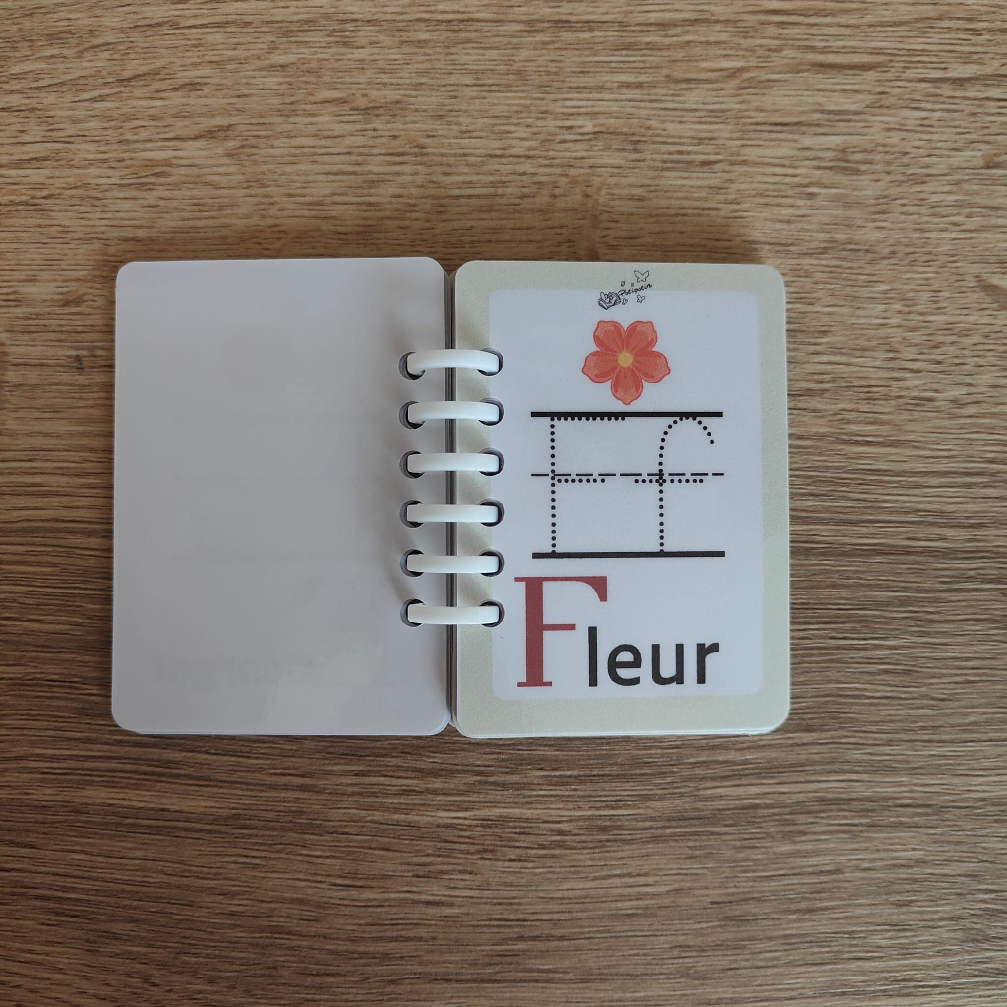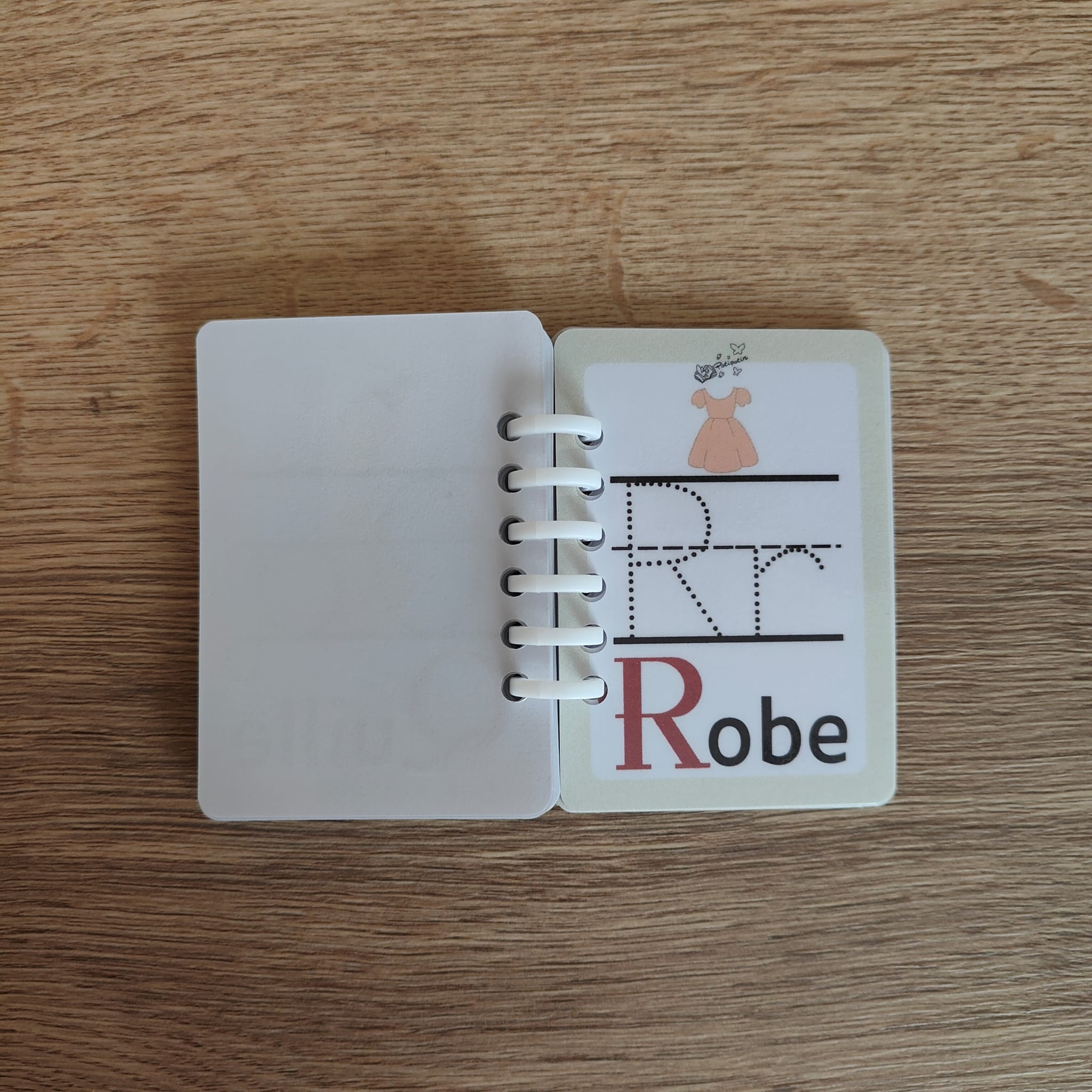 📦 Livret prêt à l’emploi : Les cartes de l’alphabet reliées par un anneau, formant un petit carnet d’écriture robuste et facile à transporter.