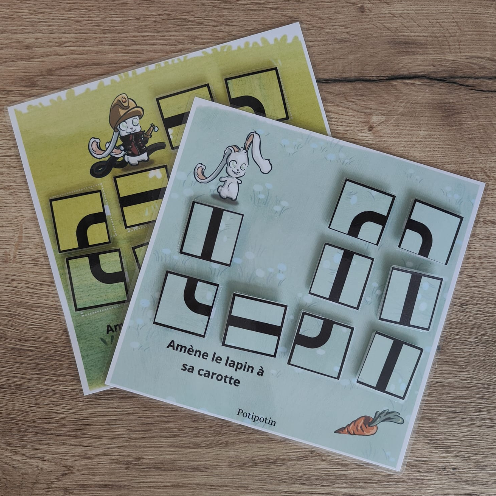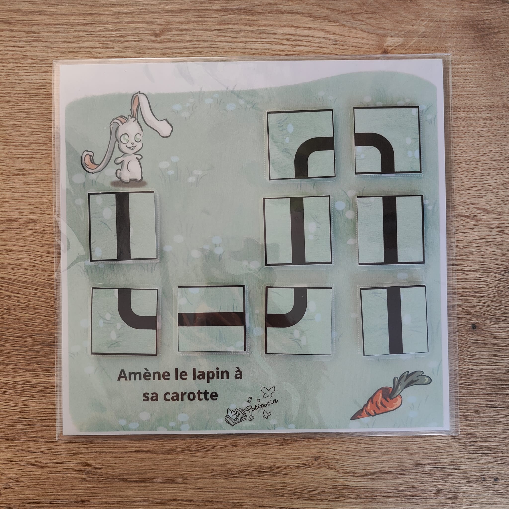 Développement de la logique : L’enfant doit observer le tracé et faire pivoter les pièces pour reconstruire le chemin continu du lapin jusqu’au feu. Un excellent exercice de résolution de problèmes !